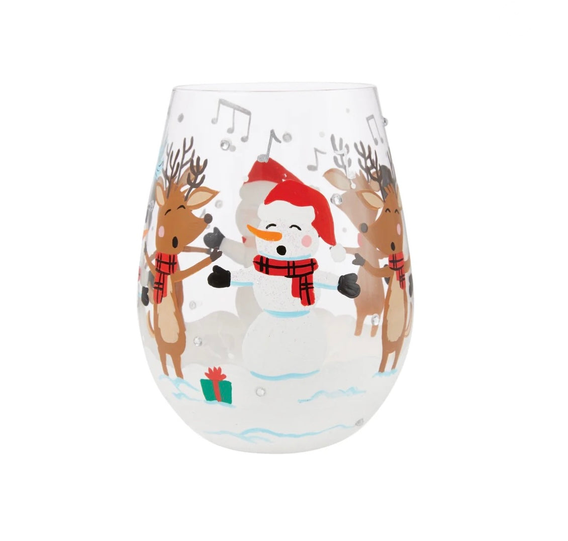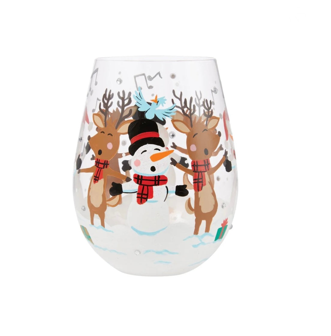 This cheerful stemless wine glass from Lolita shares a scene of Christmas spirit. In matching red plaid scarves, snowmen and reindeer stand together in song. Caroling with gusto and grace, the rosy cheeked troupe sing amongst crystal snowflakes.