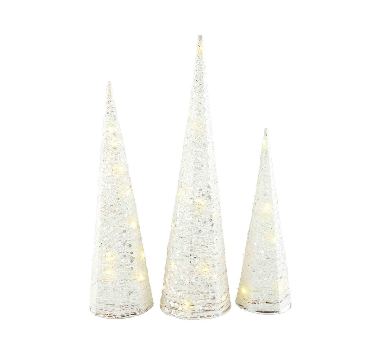 Transform your holiday decorations with the mesmerizing allure of our White Light Up Tree Cones. This enchanting set includes three Christmas tree cones that radiate a magical glow. Crafted with precision from glitter wire cones, these trees add a touch of elegance to any festive setting. The light-up feature adds a warm and inviting ambiance to your home during the holiday season.