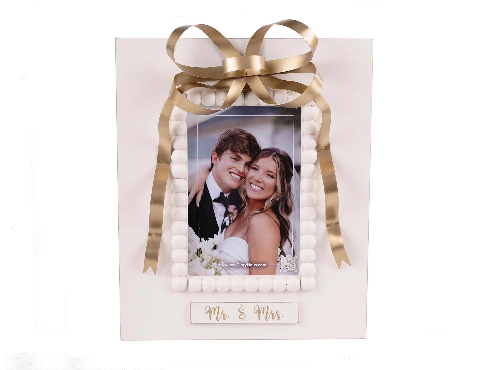 Commemorate a special day or cherish your favorite couple photo with the Mr. & Mrs. Gold Bow Frame! Featuring elegant lettering and a shimmering gold bow accent, this frame adds a sophisticated and romantic touch to wedding décor, anniversary displays, or newlywed keepsakes. Perfect for mantels, bedside tables, or gift-giving, it captures the beauty of love and commitment in timeless style. A perfect gift for weddings, anniversaries, or bridal showers.